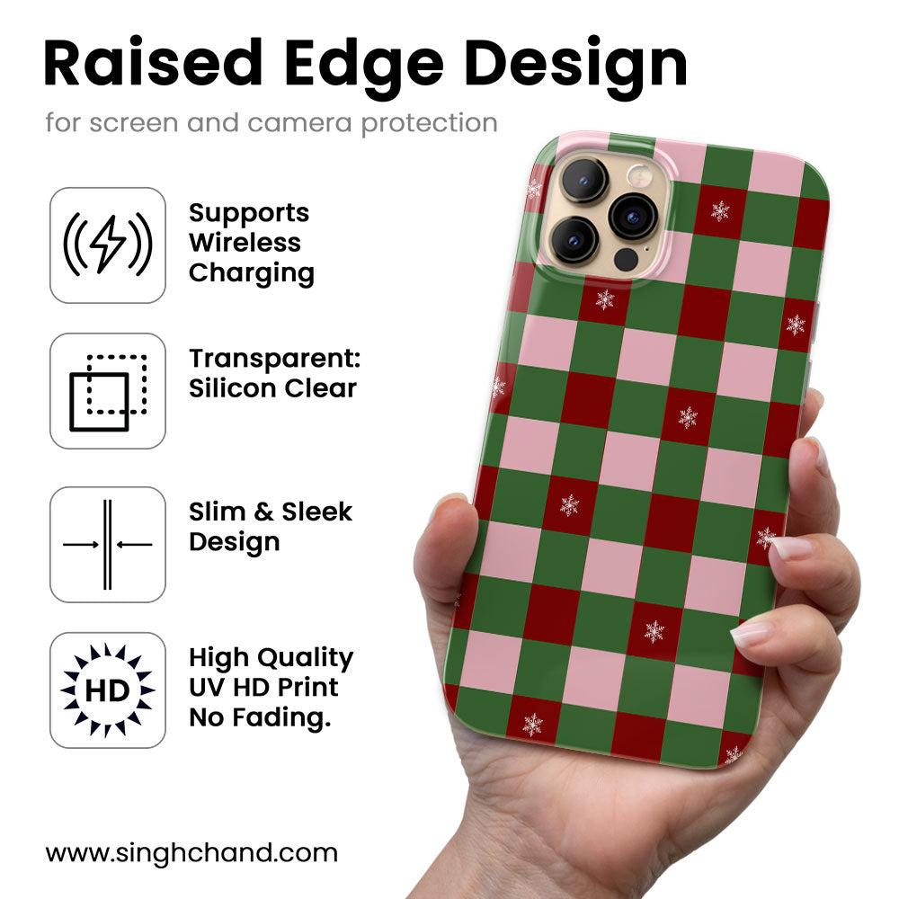 Embrace the holiday spirit with the Frosted Festive Plaid Phone Case. This eye-catching design features a classic checkerboard pattern in pink, green, and deep red, enhanced by delicate white snowflakes that add a wintery charm. Perfectly blending tradition and festive cheer, this case is an ideal accessory for the holiday season.