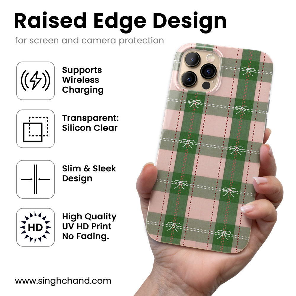 Add a touch of timeless elegance to your phone with the Plaid Elegance Bow-Tie Phone Case. Featuring a sophisticated blend of soft pink and green plaid patterns, accented with delicate white bows and bold red dotted lines, this design perfectly captures the festive charm of the holiday season.