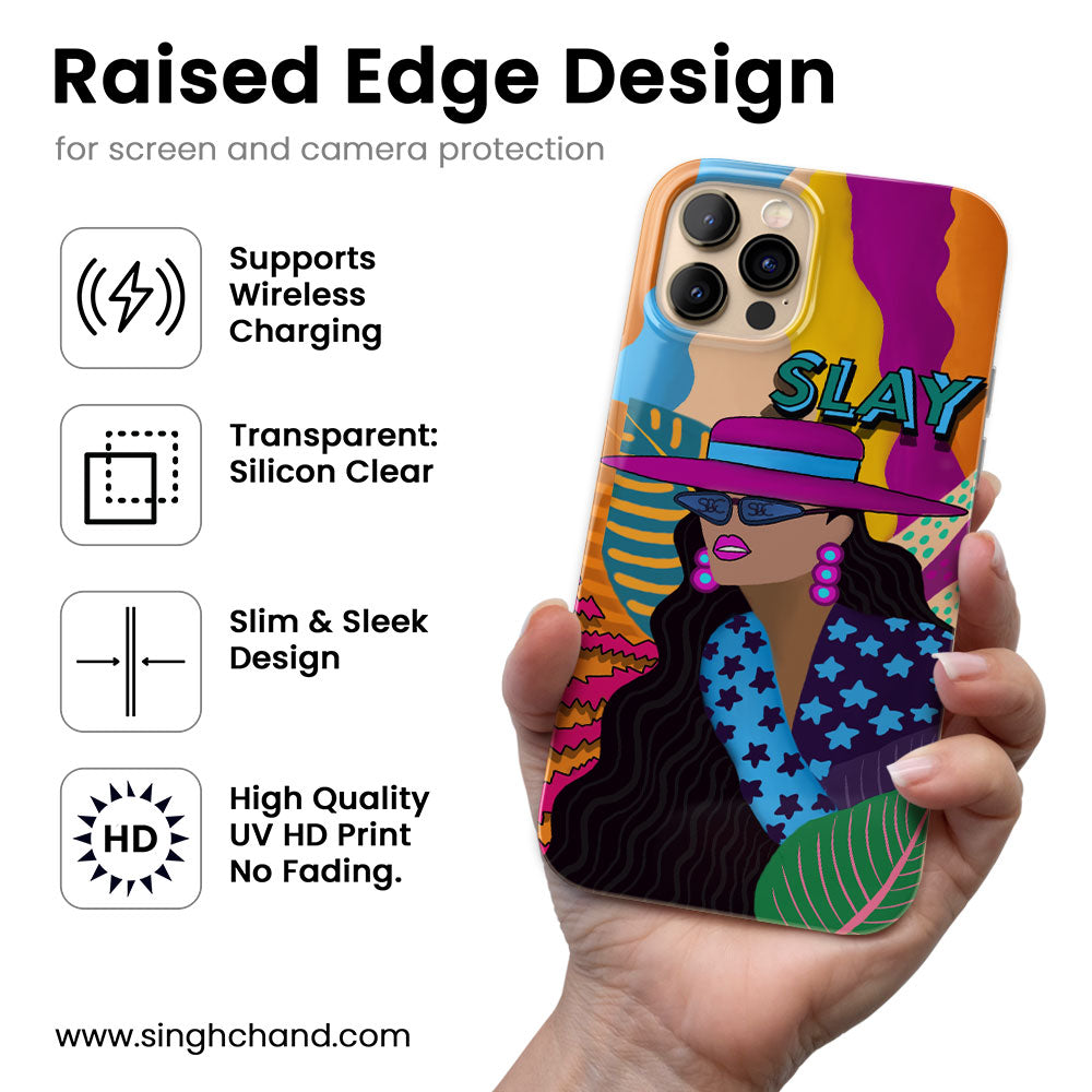 Stand out with this bold "SLAY" iPhone case featuring a stylish, colorful character and tropical background. Designed to protect your phone while adding a pop of personality, it’s perfect for those who love unique, fashion-forward accessories.
